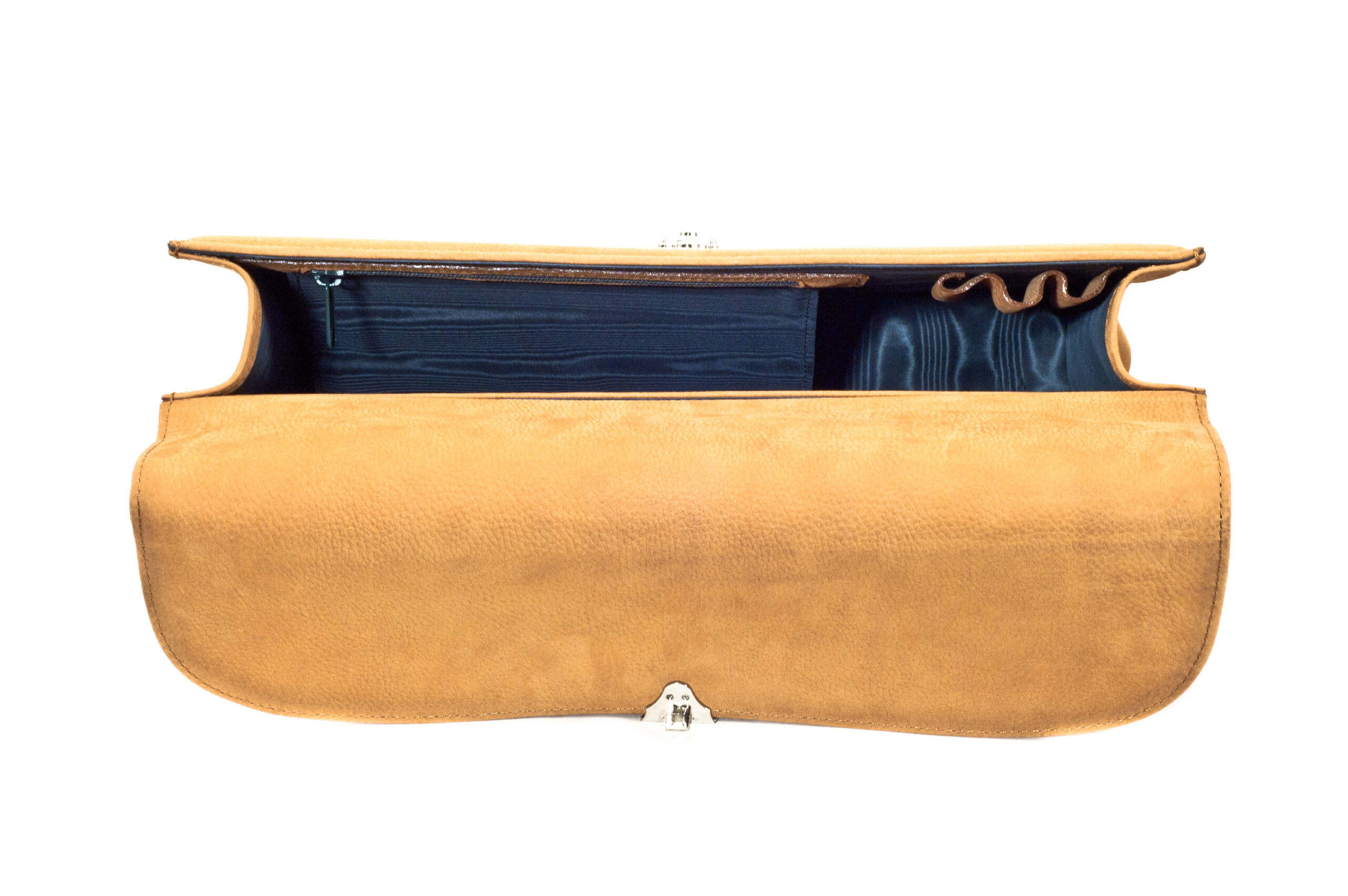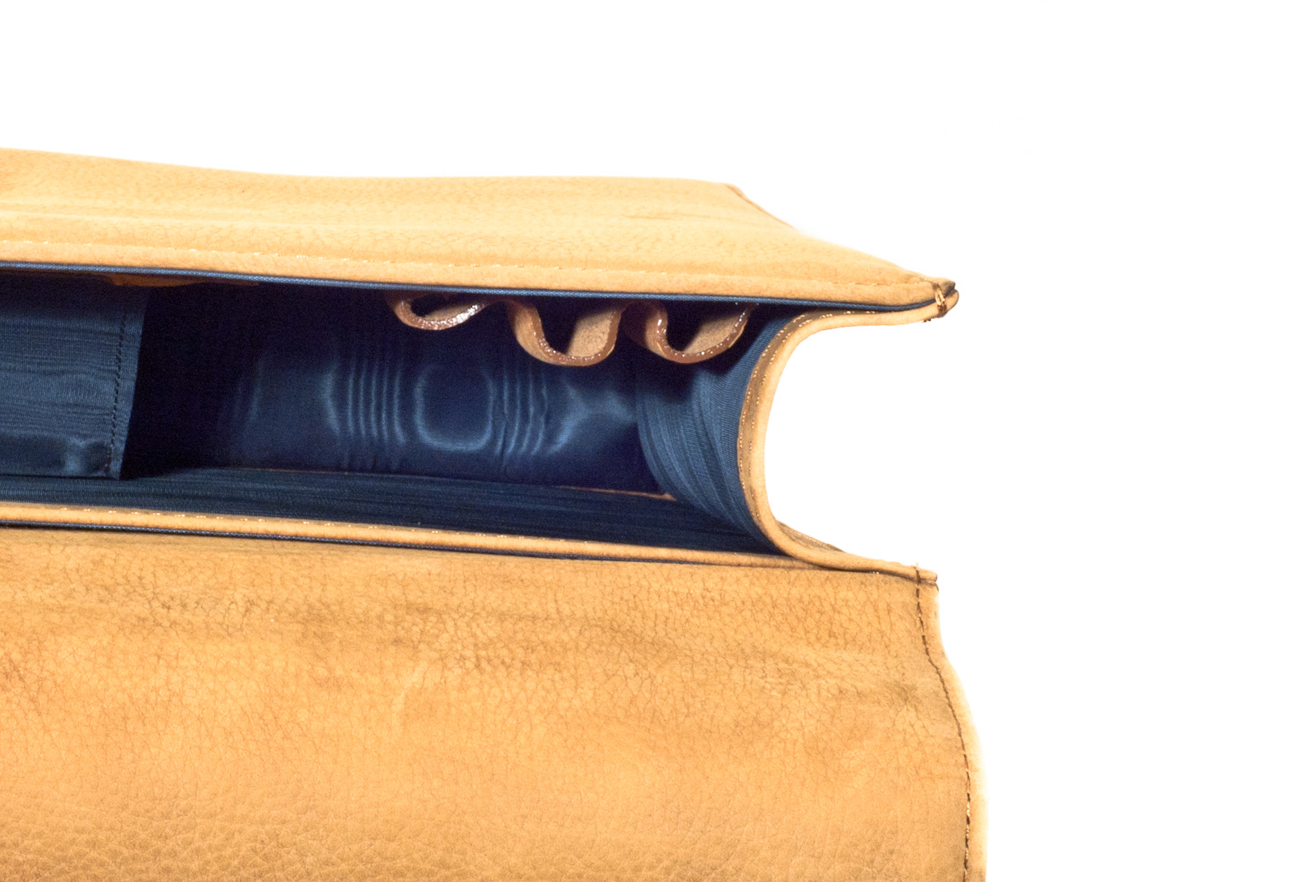 Eine klassische Aktentasche in der für R. Horn’s typischen Ausführung mit einem Hauptfach, einem kleinen Zippfach, Federschlaufen sowie einem Klemmfach, welches an der Innenseite der Tasche angebracht ist, um unerwünschte Ausbeulungen zu vermeiden.