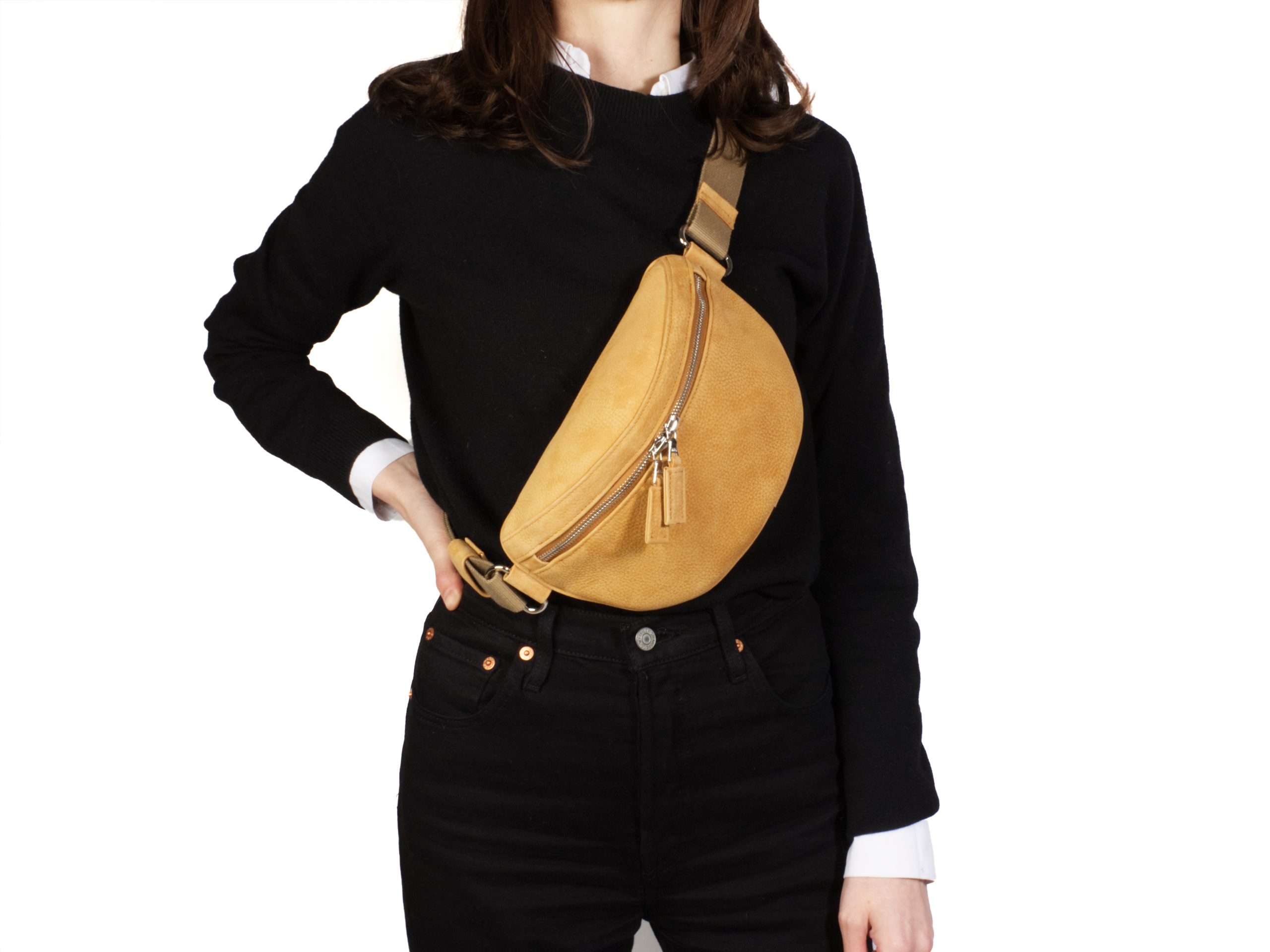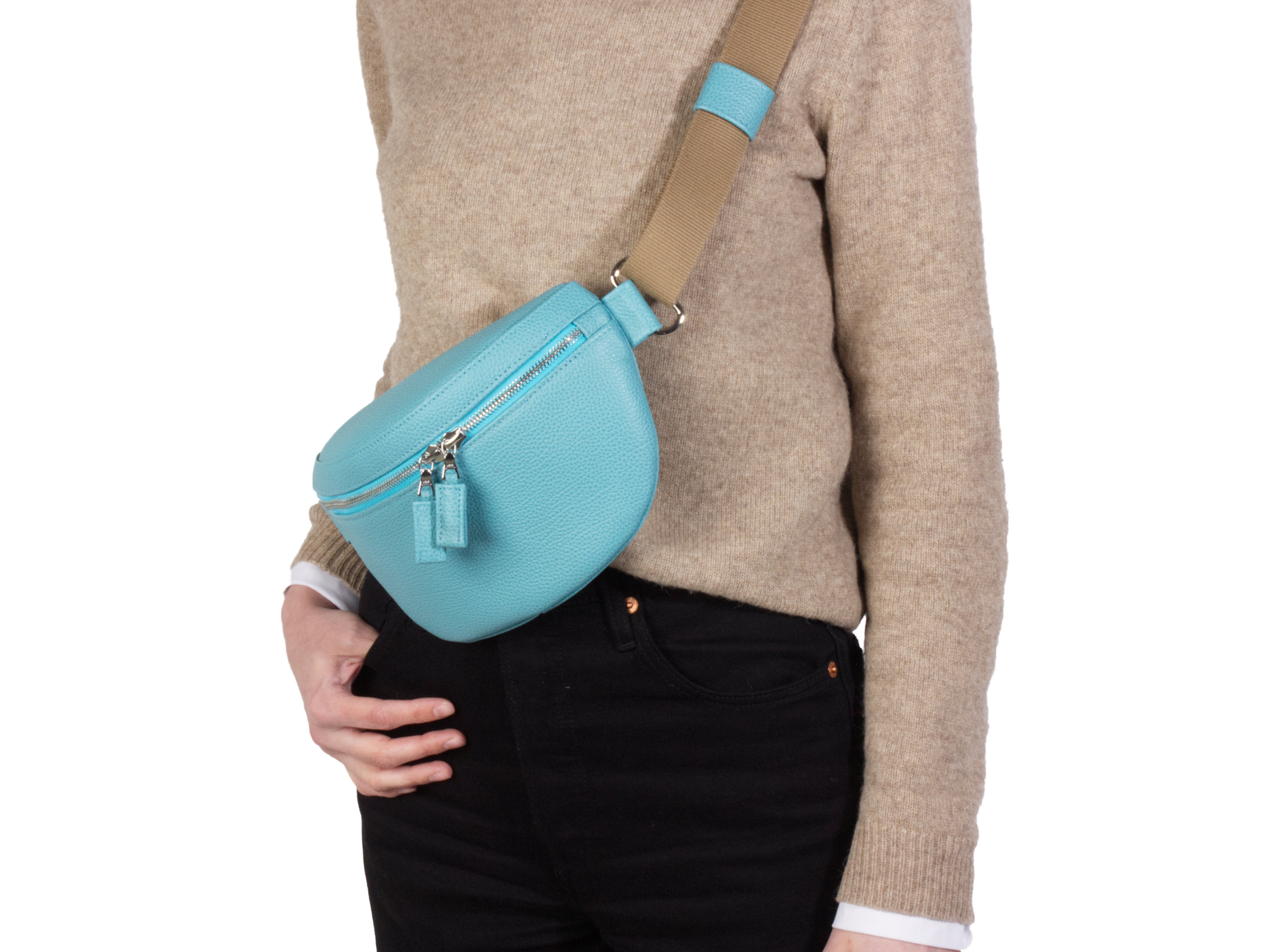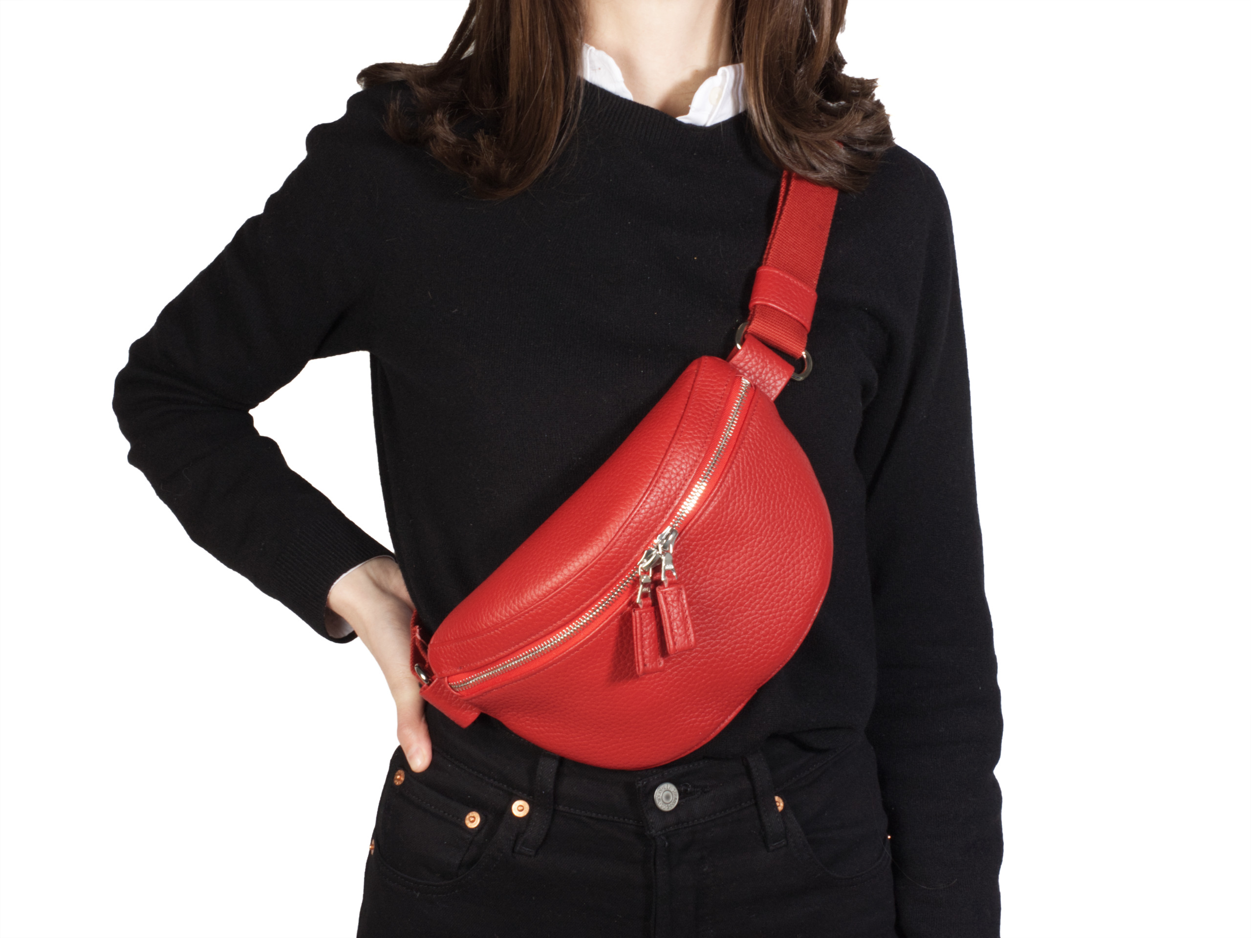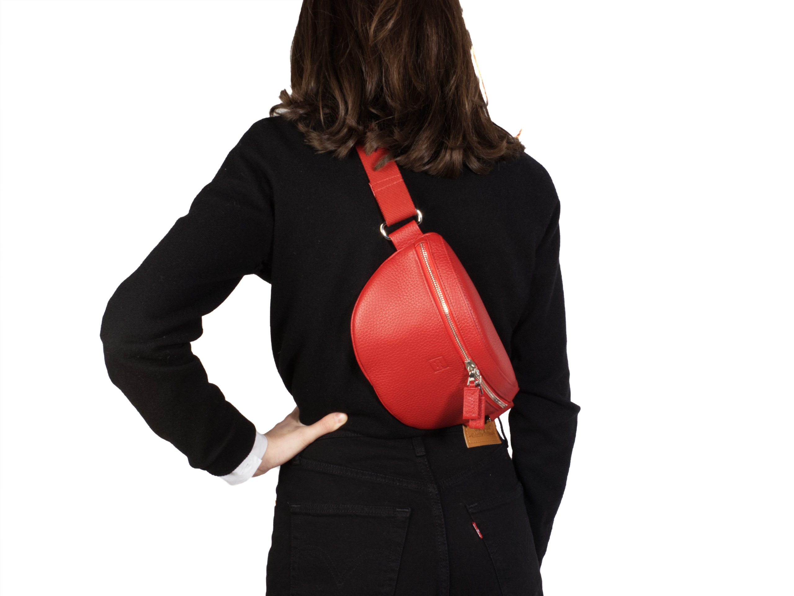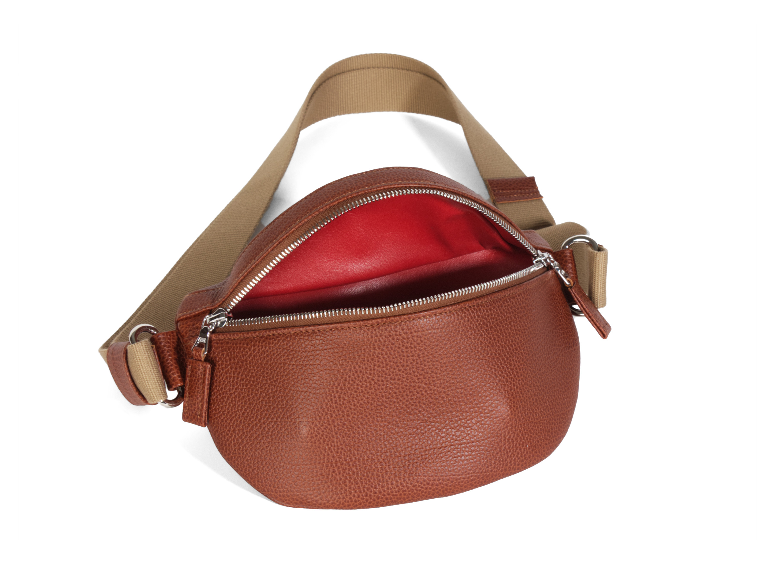 Unsere Bauchtasche ist eine praktische Tasche für die allernötigsten Dinge unterwegs. Die beiden Innenfächer sind mit edlem roten Ziegenleder gefüttert. Der Stoffgurt ist stufenlos verstellbar.