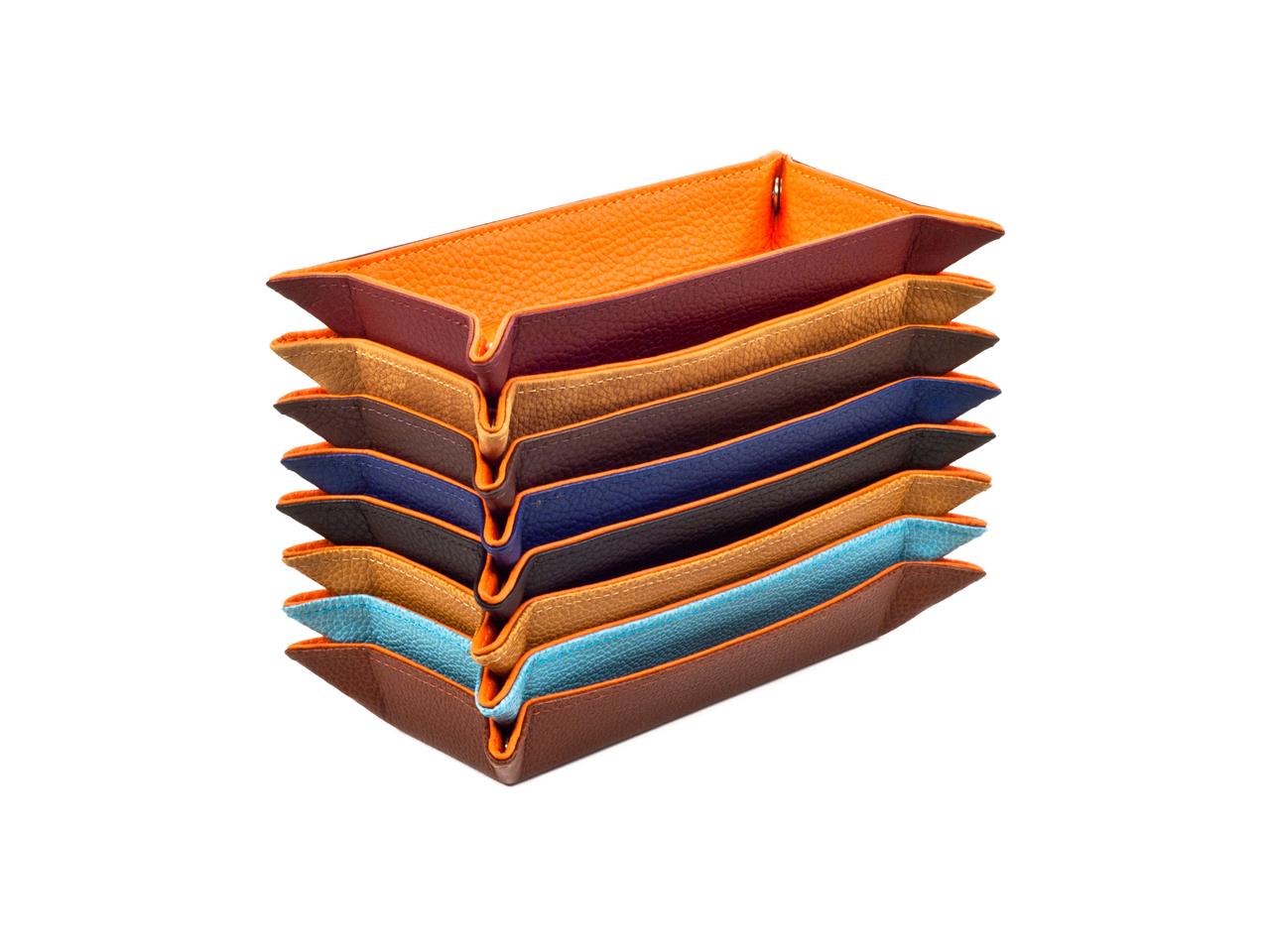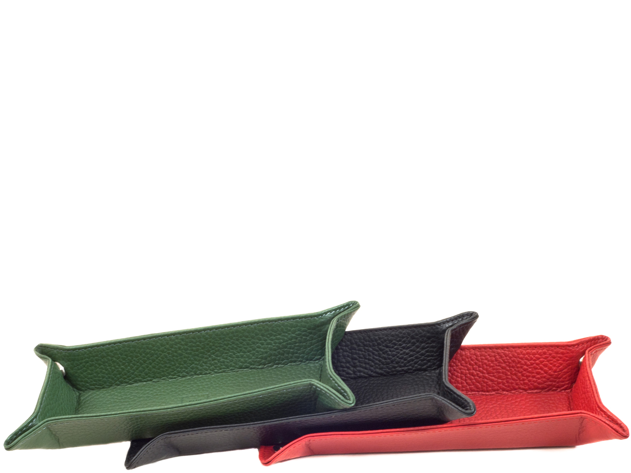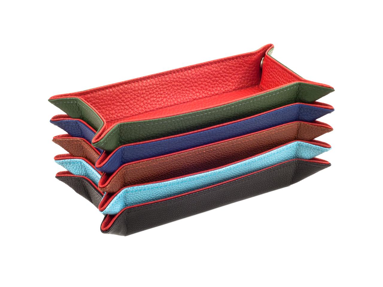 Eine elegante, portable Reiseablage für Kleingeld, Schmuck, Manschettenknöpfe, Stifte usw. Die Schnapp-Ecken lassen sich aufklappen und flach hinlegen. Erhältlich in einer Farbe oder mit roter oder oranger Innenseite.