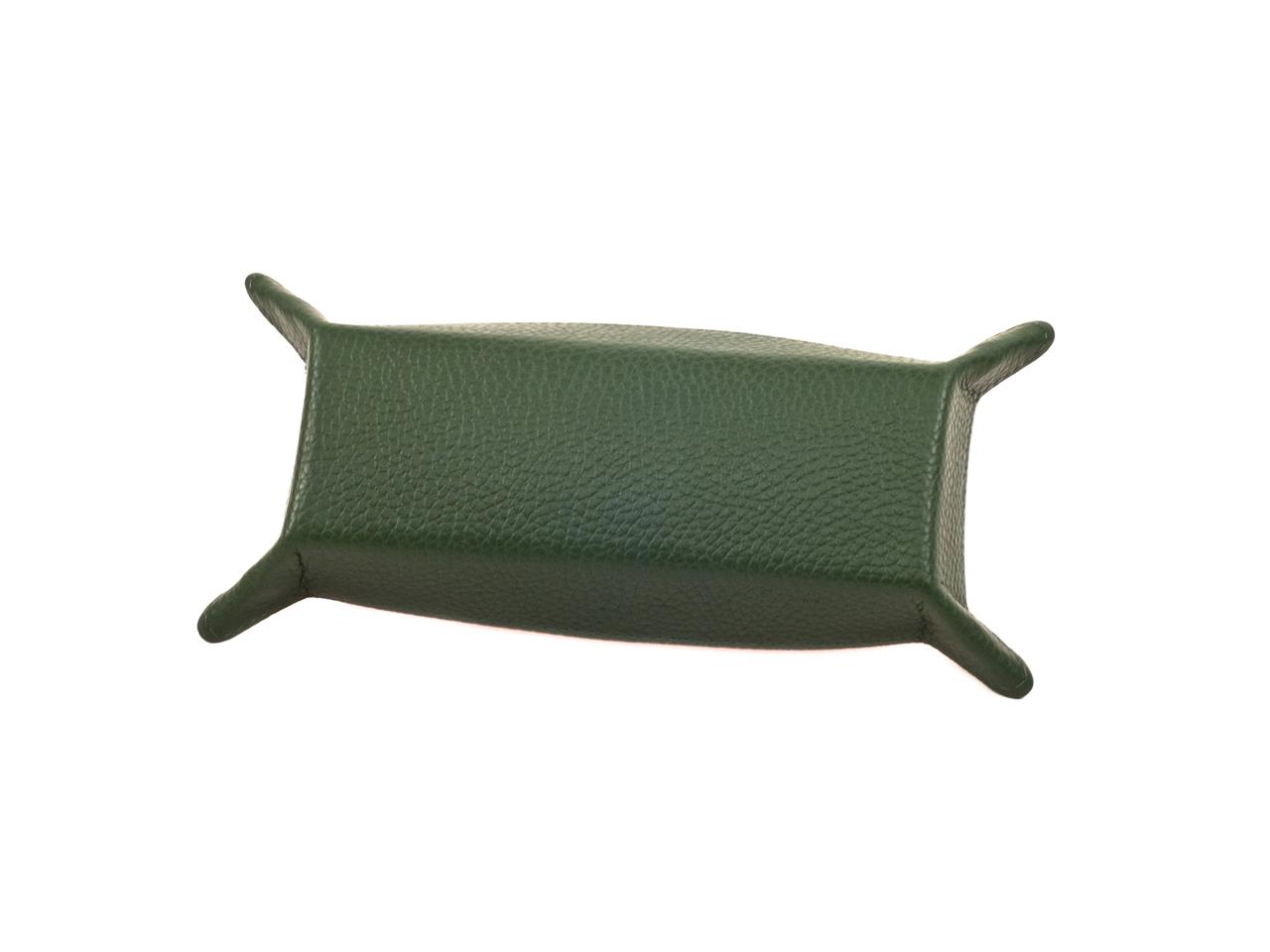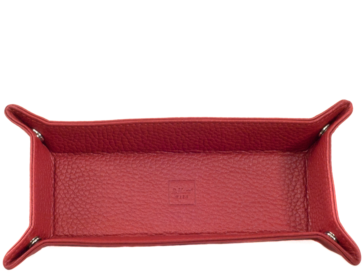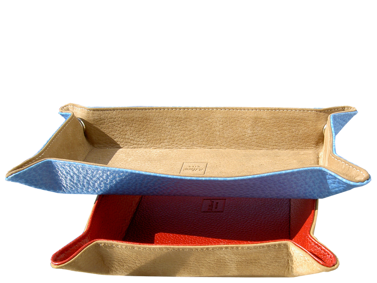 Eine elegante, portable Reiseablage für Kleingeld, Schmuck, Manschettenknöpfe, Stifte usw. Die Schnapp-Ecken lassen sich aufklappen und flach hinlegen. Erhältlich in einer Farbe oder mit roter oder oranger Innenseite.