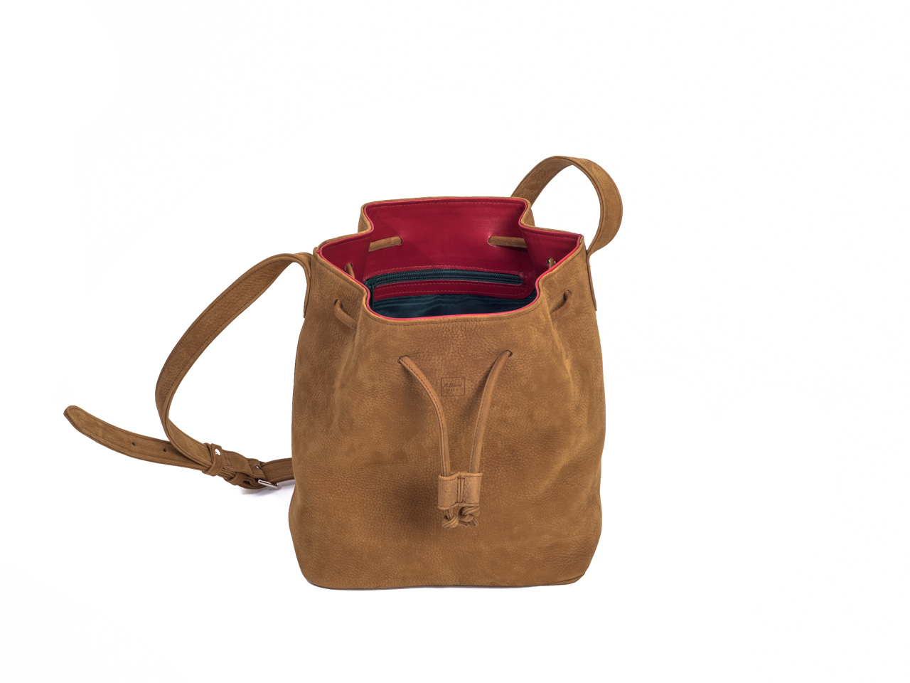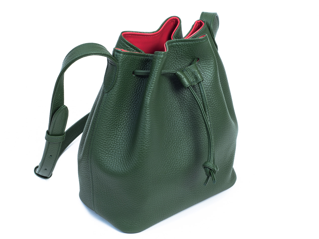 Ein praktischer Beutel im Stil des klassischen Seesackes. Er wird oben mit einem Lederband zusammengezogen.. Gefüttert ist der Seesack mit grünem Seidenmoire und hat ein flaches Zippfach. Der Tragegurt ist verstellbar.